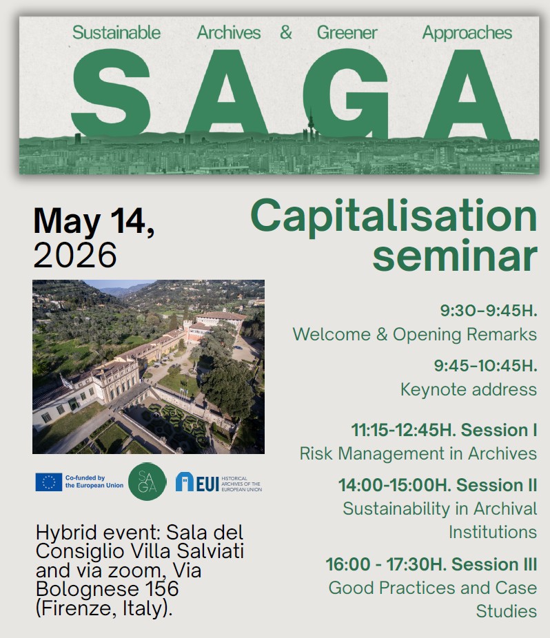 14 maja 2026 r. we Florencji odbędzie się seminarium kapitalizacyjne projektu SAGA. Wydarzenie zgromadzi profesjonalistów z dziedziny archiwistyki, którzy będą dzielić się doświadczeniami, omawiać oraz promować kluczowe wyniki osiągnięte dotychczas w ramach projektu.